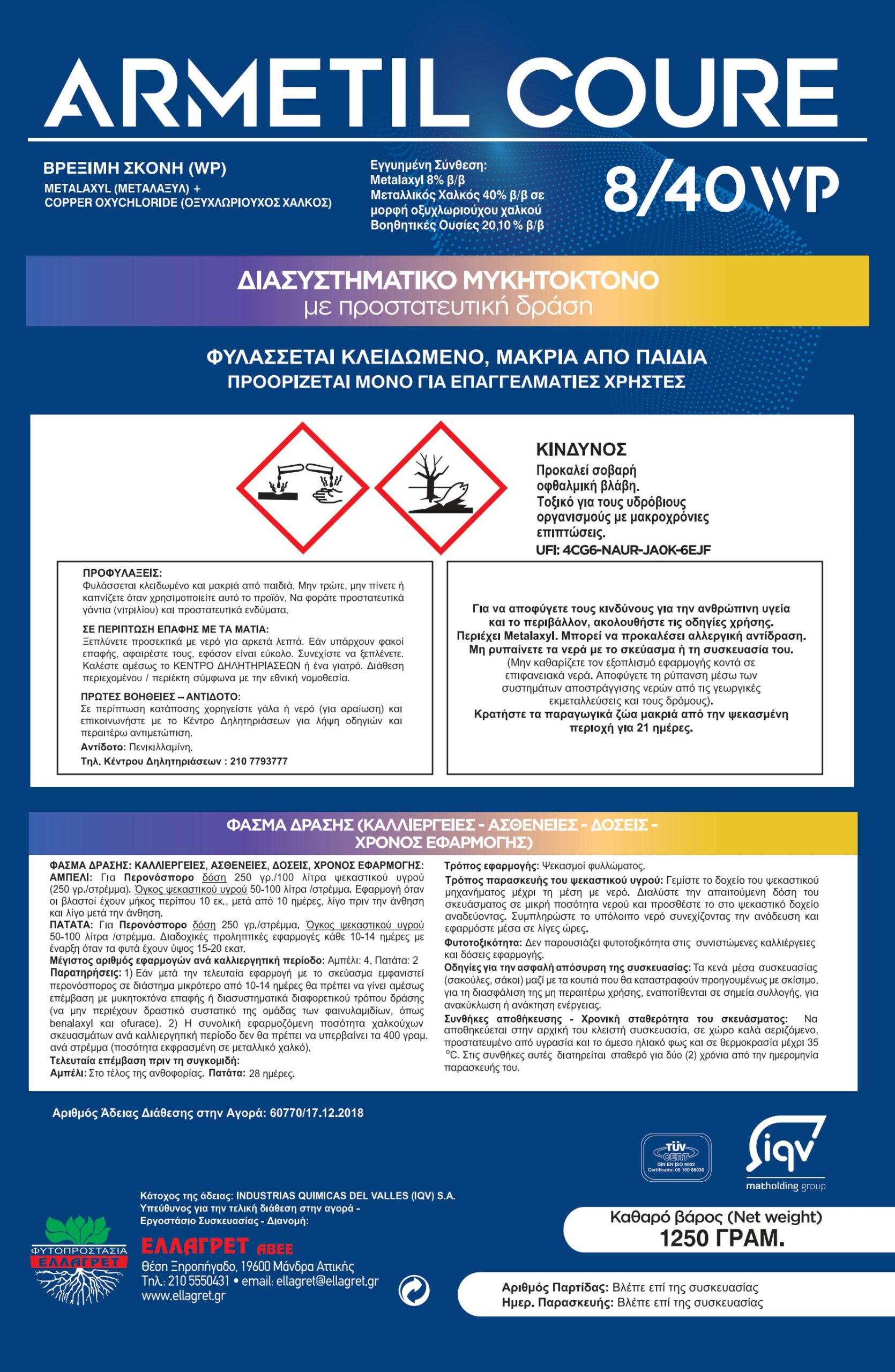 Metalaxyl 8% β/β Μεταλλικός χαλκός 40 % β/β (σε μορφή οξυχλωριούχου χαλκού)