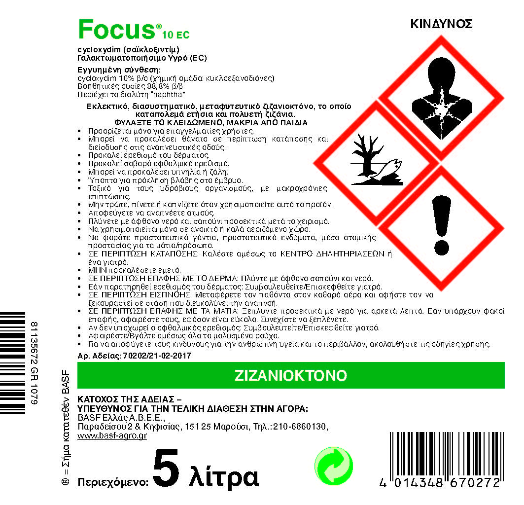 Εκλεκτικό, διασυστηματικό, μεταφυτευτικό ζιζανιοκτόνο, το οποίο καταπολεμά ετήσια και πολυετή ζιζάνια. To FOCUS 10 EC περιέχει το δραστικό συστατικό cycloxydim, που ανήκει στη χημική ομάδα των κυκλοεξανοδιονών. Το cycloxydim απορροφάται από τα φύλλα και παρεμποδίζει το σχηματισμό των μεριστωματικών ιστών των ευαίσθητων ζιζανίων. Σε βιοχημικό επίπεδο παρεμποδίζει την καρβοξυλάση του ακετυλοσυνενζύμου Α στη βιοσύνθεση των λιπαρών οξέων.