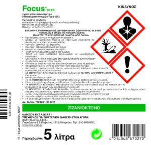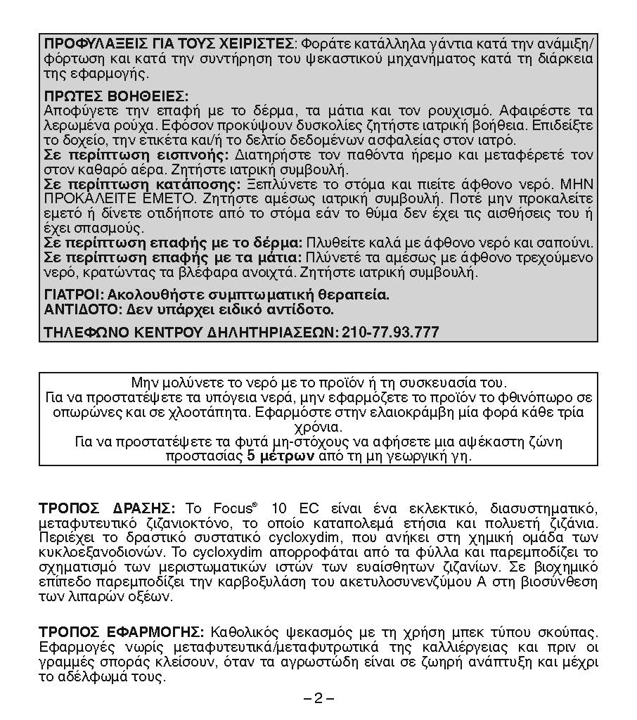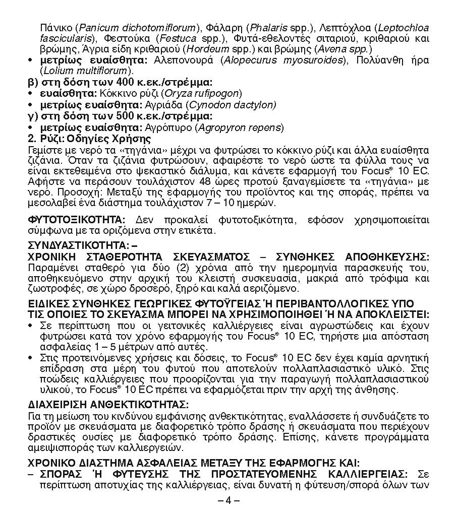 Σε περίπτωση που οι γειτονικές καλλιέργειες είναι αγρωστώδεις και έχουν φυτρώσει κατά τον χρόνο εφαρμογής του Focus 10 EC, τηρήστε μια απόσταση ασφαλείας 1-5 μέτρων από αυτές. Στις προτεινόμενες χρήσεις και δόσεις, το Focus 10 EC δεν έχει καμία αρνητική επίδραση στα μέρη του φυτού που αποτελούν πολλαπλασιαστικό υλικό. Στις ποώδεις καλλιέργειες που προορίζονται για την παραγωγή πολλαπλασιαστικού υλικού, το Focus 10 EC πρέπει να εφαρμόζεται πριν την αρχή της άνθισης. Διαχείριση ανθεκτικότητας Για τη μείωση του κινδύνου εμφάνισης ανθεκτικότητας, εναλλάσσετε ή συνδυάζετε το προϊόν με σκευάσματα με διαφορετικό τρόπο δράσης ή σκευάσματα που περιέχουν δραστικές ουσίες με διαφορετικό τρόπο δράσης. Επίσης, κάνετε προγράμματα αμειψισποράς των καλλιεργειών