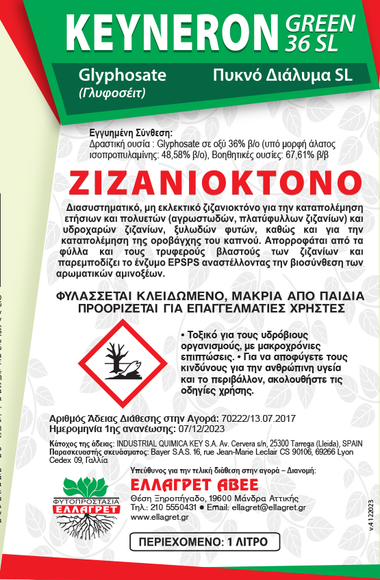 Glyphosate σε οξύ 36% β/ο (υπό μορφή άλατος ισοπροπυλαμίνης: 48,58% β/ο)