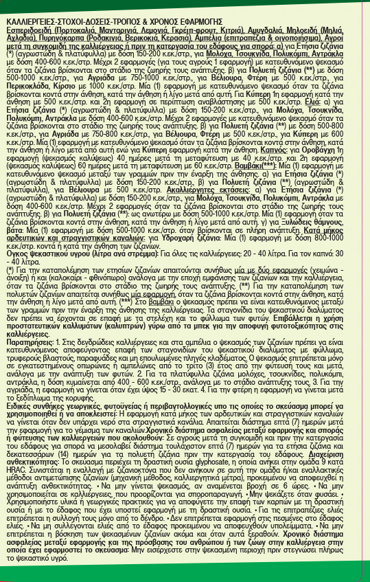 Η εφαρμογή κατά μήκος των αρδευτικών και στραγγιστικών καναλιών να γίνεται όταν δεν υπάρχει νερό στα στραγγιστικά κανάλια. Απαιτείται διάστημα επτά (7) ημερών μετά την εφαρμογή για το γέμισμα των καναλιών. Διαχείριση ανθεκτικότητας Το σκεύασμα περιέχει τη δραστική ουσία glyphosate, η οποία ανήκει στην ομάδα 9 κατά HRAC. Συνιστάται η εναλλαγή με ζιζανιοκτόνα που δεν ανήκουν σε αυτή την ομάδα ή/και εναλλακτικές μέθοδοι αντιμετώπισης ζιζανίων (μηχανική μέθοδος, καλλιεργητικά μέτρα), προκειμένου να αποφευχθεί η ανάπτυξη ανθεκτικότητας.  Να μην γίνεται ψεκασμός, αν αναμένεται βροχή σε 6 ώρες.  Να μην χρησιμοποιείται σε καλλιέργειες, που προορίζονται για σποροπαραγωγή.  Μην ψεκάζετε όταν φυσάει.  Χρησιμοποιήστε υλικά ή γεωργικές πρακτικές για να αποφύγετε την επαφή των καρπών με τη δραστική ουσία ή με το έδαφος που έχει υποστεί εφαρμογή με τη δραστική ουσία.  Για τις επιτραπέζιες ελιές επιτρέπεται η συλλογή τους μόνο από το δένδρο.  Δεν επιτρέπεται εφαρμογή στις πεσμένες στο έδαφος ελιές.  Να μη συλλέγονται ελιές από το έδαφος προκειμένου να αποφευχθούν υπολείμματα.  Να μην επιτρέπεται η βόσκηση των ψεκασμένων ζιζανίων ακόμα και όταν αυτά ξεραθούν