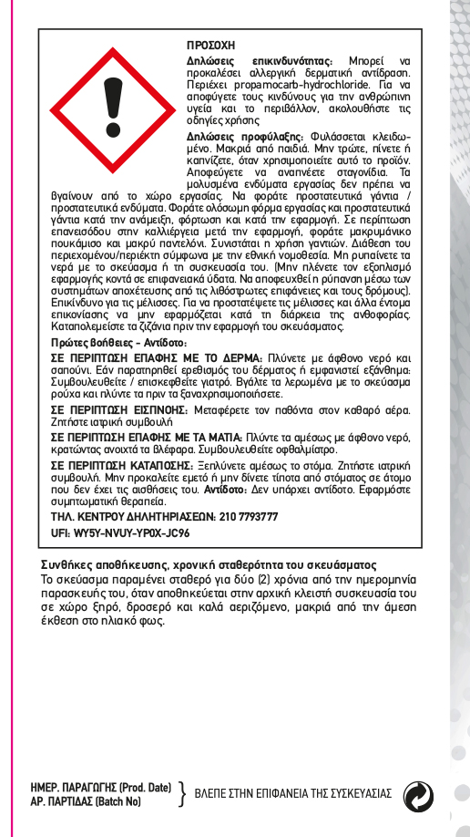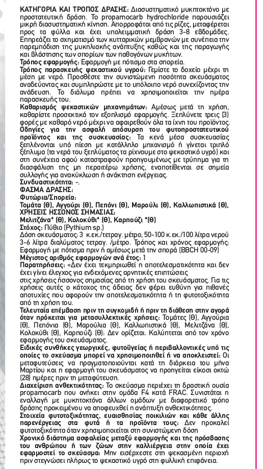∆ιασυστηµατικό µυκητοκτόνο µε προστατευτική δράση. Το propamocarb hydrochloride παρουσιάζει μικρή διασυστηματική κίνηση. Απορροφάται από τις ρίζες, μεταφέρεται προς τα φύλλα και έχει υπολειμματική δράση 3-8 εβδομάδες. Επηρεάζει το σχηματισμό των κυτταρικών μεμβρανών µε συνέπεια την παρεμπόδιση της μυκηλιακής ανάπτυξης καθώς και της παραγωγής και βλάστησης των σπορίων των παθογόνων μυκήτων.